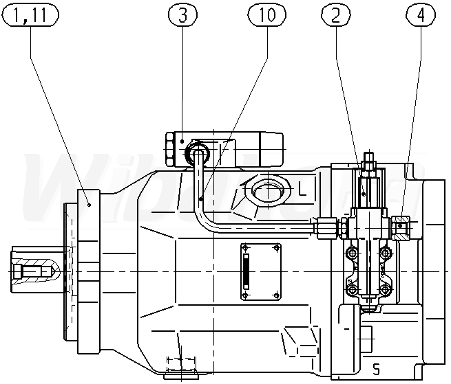 Pompa tłokowa osiowa o zmiennej objętości roboczej A10VS, obieg otwarty, ciśnienie nominalne 280 bar, ciśnienie maksymalne 350 bar. Seria 31. Wielkość nominalna 45 cm3. Ciśnieniowo przepływowy regulator mocy. Uszczelnienia: FKM (kauczuk fluorowy).