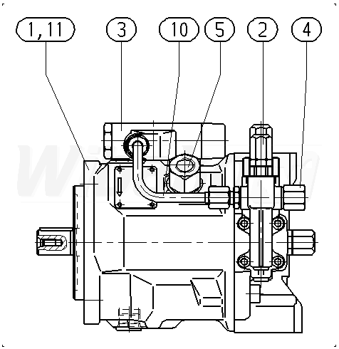 Pompa tłokowa osiowa o zmiennej objętości roboczej A10VS, obieg otwarty, ciśnienie nominalne 280 bar, ciśnienie maksymalne 350 bar. Seria 31. Wielkość nominalna 71 cm3. Ciśnieniowo przepływowy regulator mocy.