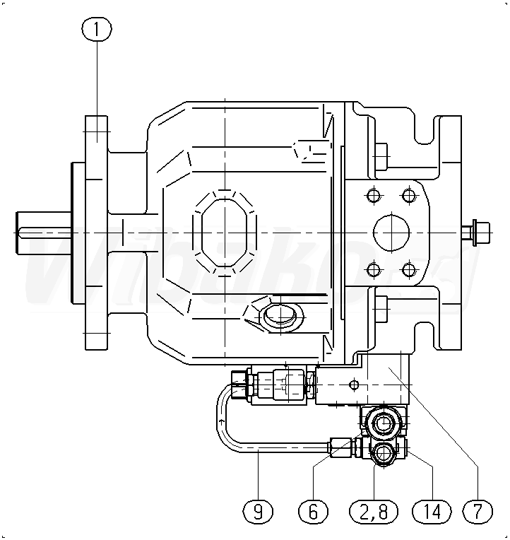 Pompa tłokowa osiowa o zmiennej objętości roboczej A10VS, obieg otwarty, ciśnienie nominalne 280 bar, ciśnienie maksymalne 350 bar. Seria 31. Wielkość nominalna 100 cm3. Ciśnieniowy sterownik hydrauliczny z zaworem odcinającym, sterowany zdalnie